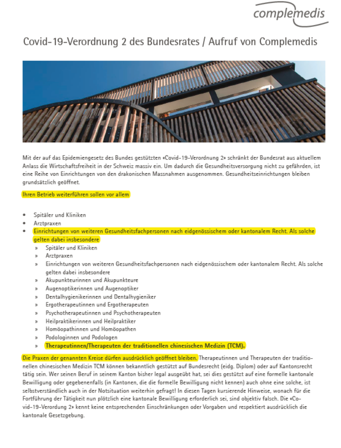 Heute Vormittag kam vom TCM-Verband eine Präzisierung bezüglich dem Offenhalten der Praxis.