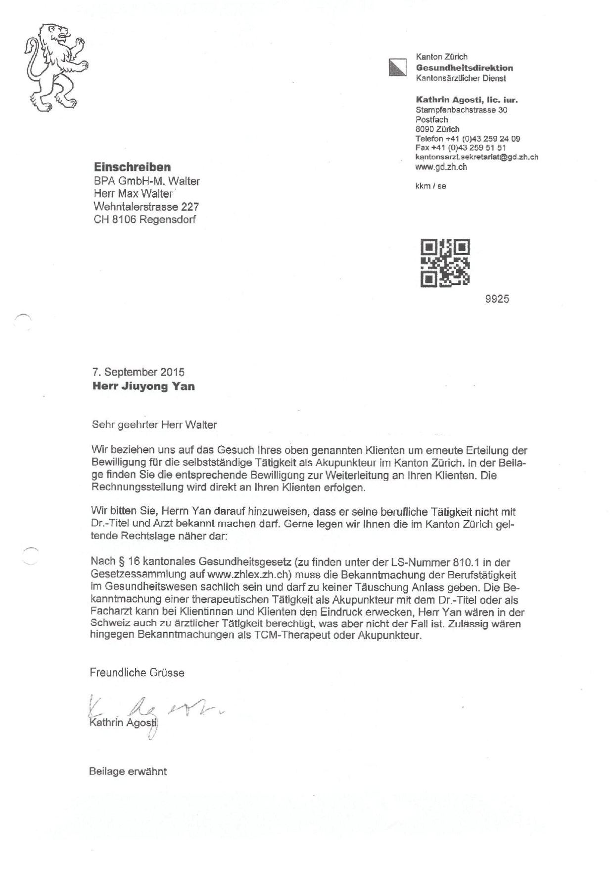 Wie Sie hier sehen haben wir die Kantonale Praxisbewilligung für den Kanton Zürich